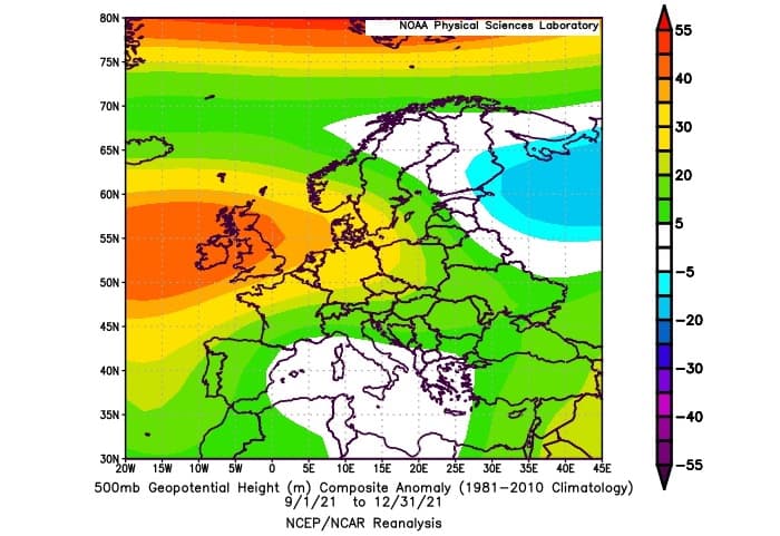 Pour vérifier l'omniprésence de ces blocages anticycloniques, on peut s'intéresser à l'anomalie de géopotentiels sur plusieurs mois. La carte ci-dessous fait la moyenne des 4 derniers mois de l'année 2021 (de septembre à décembre). Elle met en évidence une importante anomalie de hautes pressions sur les Îles Britanniques et le nord de la France. De telles anomalies lissées sur une période de 4 mois sont significatives et témoignent du caractère majoritaire des blocages anticycloniques au détriment du flux océanique perturbé.