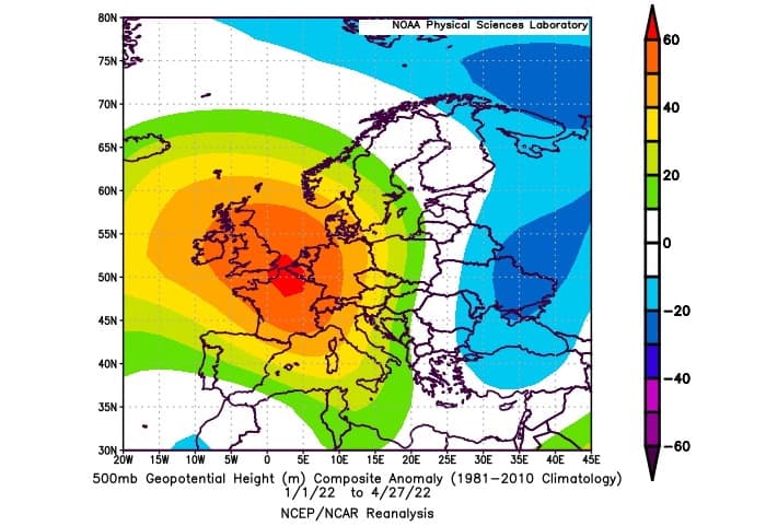 La situation est loin de s'être améliorée en 2022, bien au contraire ! La même carte moyennée sur les 4 premiers mois de l'année 2022 témoigne d'une anomalie de hautes pressions encore plus forte sur l'Europe de l'Ouest avec un épicentre entre le nord de la France, le Benelux et l'Angleterre. Cette anomalie anticyclonique atteint des niveaux remarquables et témoigne de la très faible occurrence de courants océaniques perturbés, pourtant censés être majoritaires sur nos régions.