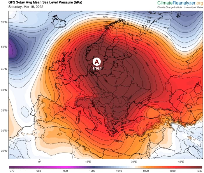 Énorme blocage anticyclonique sur l'Europe le 19 mars 2022 - carte climatereanalyzer.org