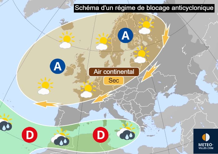 Schéma d'un régime de blocage anticyclonique, récurrent ces derniers mois - Météo Villes