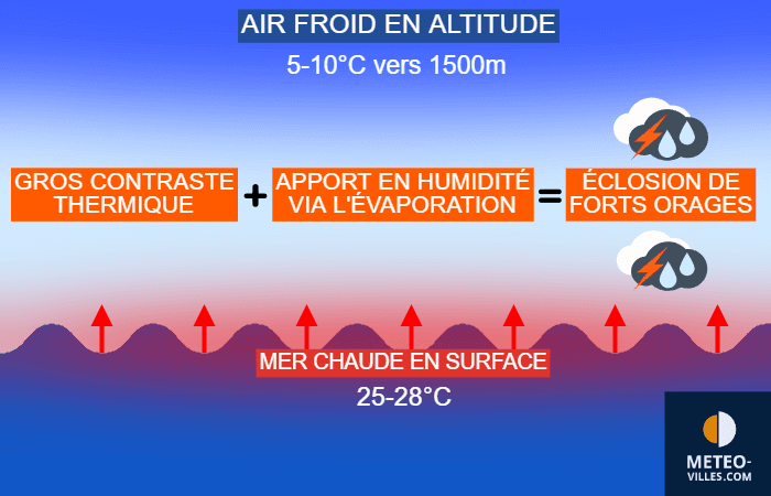 En effet, la fin de l'été est la période de l'année où la température moyenne de l'eau de mer est la plus élevée. Chauffées tout au long de l'été, les eaux de la Méditerranée sont encore très chaudes au mois de septembre. Lorsque des coulées d'air frais atteignent le bassin méditerranéen, il y a donc un très gros contraste thermique entre la température en surface et celle en altitude (parfois 20°C d'écart sur 1500m). Ajouté à l'humidité de la mer, ce contraste thermique crée alors un environnement très favorable au développement des orages, pouvant conduire à des épisodes pluvio-orageux majeurs dans le sud-est de la France.