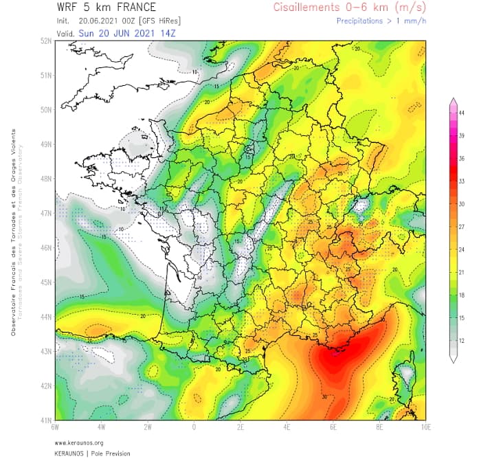 Modélisation des cisaillements en date du dimanche 20 juin 2021 - via keraunos.org
