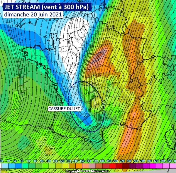 Modélisation du courant jet ou "jet stream" le dimanche 20 juin 2021 - via meteociel.fr