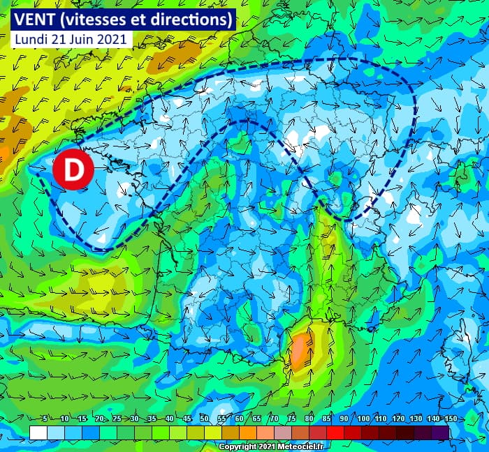 Vitesses et directions des vents le lundi 21 juin 2021 en soirée - via meteociel.fr
