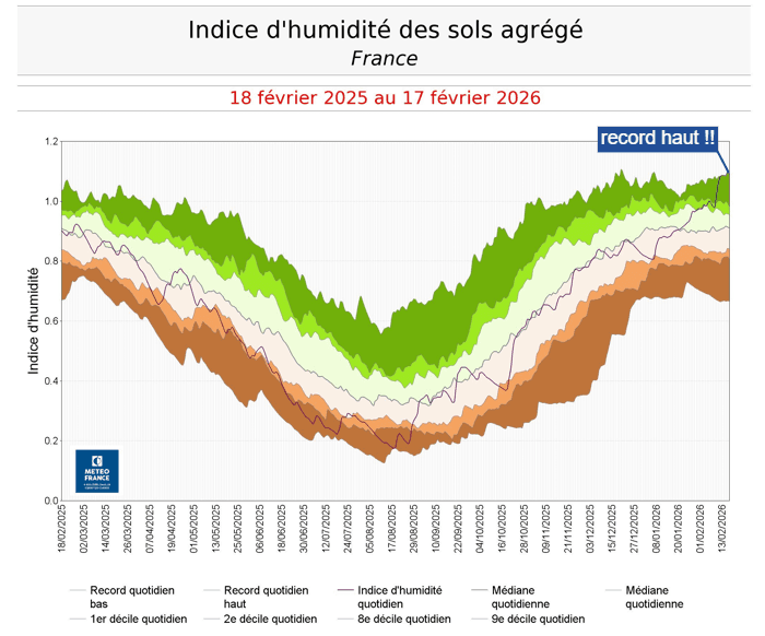 Indice d'humidité des sols en moyenne nationale du 18 février 2025 au 17 février 2026 - Météo France