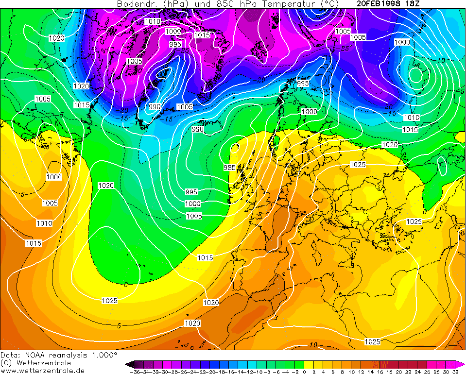 Réanalyse des masses d'air en altitude le 20 février 1998 - site Wetterzentrale.de