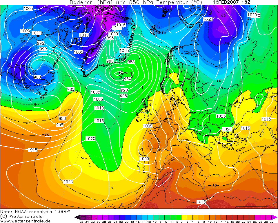 Réanalyse des masses d'air en altitude le 16 février 2007 - site Wetterzentrale.de
