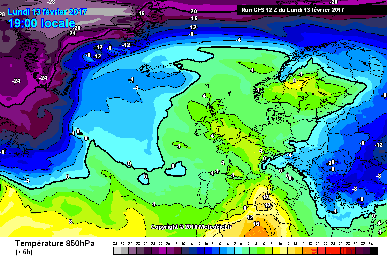 Températures à 850 hPa sur l'Ouest de l'Europe le 13 février 2017 - Modèle GFS via météociel.fr