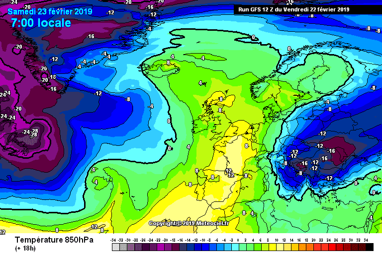 Températures à 850 hPa sur l'Ouest de l'Europe le 23 février 2019 - Modèle GFS via météociel.fr