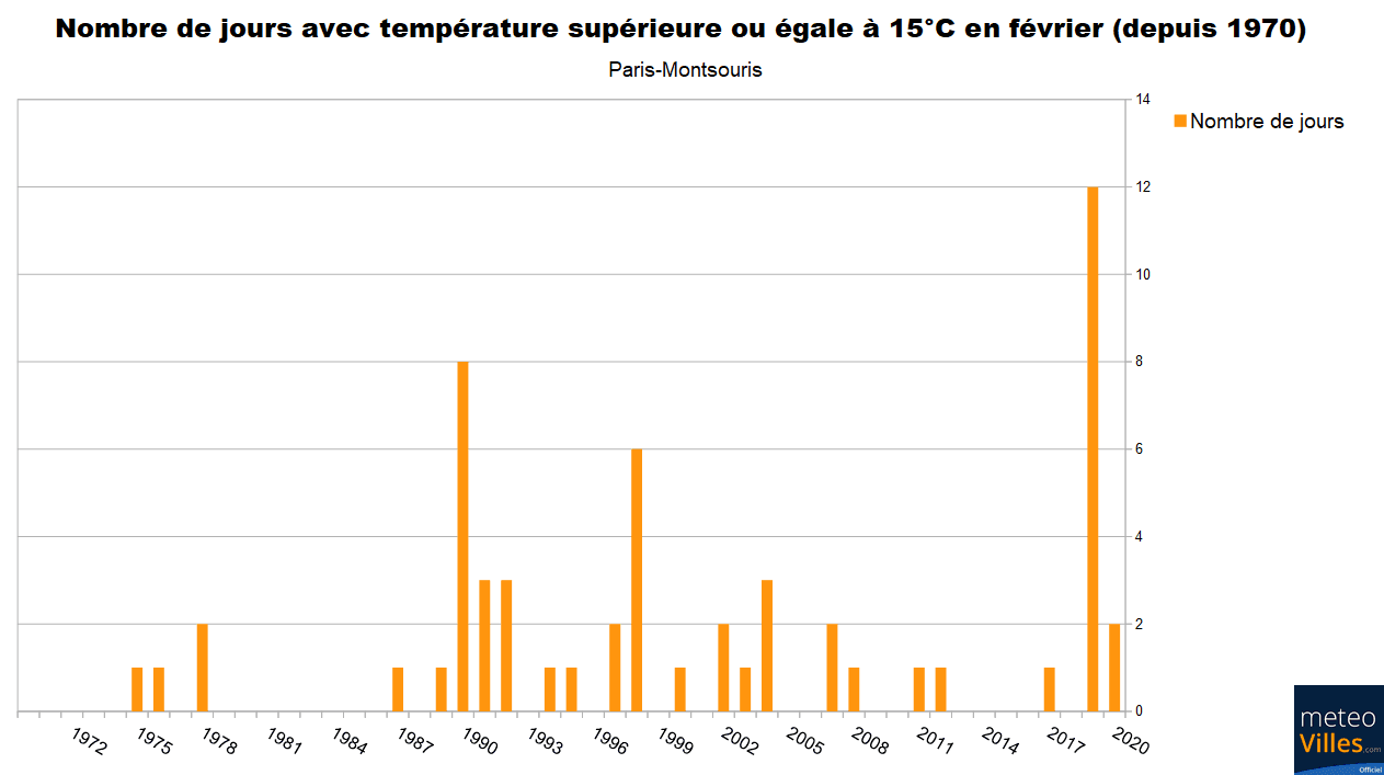 Les coups de douceur ne sont donc pas nouveaux durant le mois de février et ont toujours été observés avec plus ou moins de fréquence et d'intensité. Néanmoins, comme le montre l’évolution du nombre de jour avec température supérieure ou égale à 15°C à Paris-Montsouris depuis 1970 il semble que ce type d’épisode devienne progressivement plus récurrent à partir de février 1990