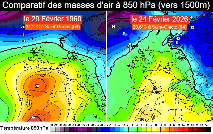 Comparatif des masses d'air observées les 29 février 1960 et 24 février 2026 - meteociel.fr