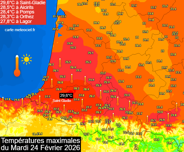 Le printemps est déjà là, pour ne pas dire l'été ! Ces dernières heures, les températures s'envolent à des niveaux remarquables en France. Les premières chaleurs de l'année ont concerné le sud-ouest ce mardi 24 février 2026. Au pied des Pyrénées, la barre des 25°C a été allègrement dépassée et on s'est même approché des 30°C dans le Béarn avec une température maximale de 29,5°C mesurée à Saint-Gladie-Arrive-Munein, loin devant son record de 27,0°C en février 2020 ! On peut aussi noter 26,6°C à Biarritz, 26,2°C à Pau, 25,9°C à Saint-Girons ou encore 25,2°C à Dax.