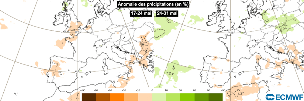 Anomalie des précipitations (en %) du 17 au 24 mai et du 24 au 31 mai - modèle CEP via ECMWF