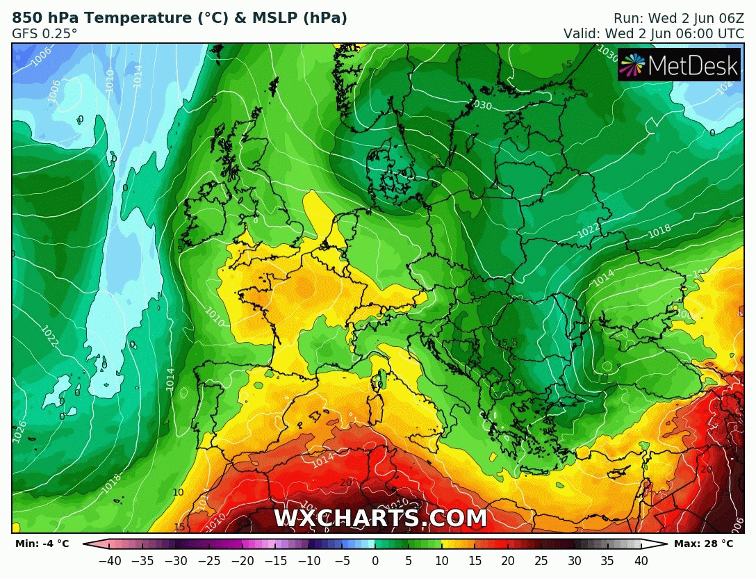 Animation des masses d'air entre le mercredi 2 et le dimanche 6 juin 2021 - via wxcharts.com