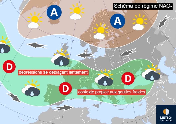 Schéma d'un régime NAO- sur le continent européen - Météo Villes