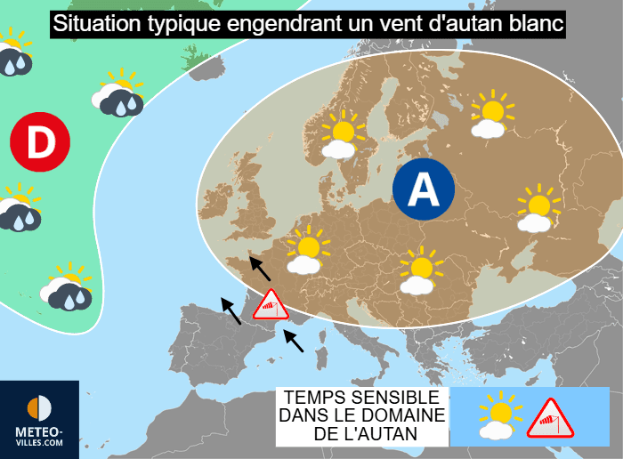 Par ailleurs, on peut distinguer deux types de vent d'autan. Le premier, que l'on qualifie d'autan blanc, est le plus fréquent. Il se produit lorsqu'un puissant anticyclone s'installe sur le centre de l'Europe et migre vers l'est, plaçant la France en flux de sud-est. Ce type d'autan est sec car il est associé à un vent marin faible, ce qui induit de faibles apports en humidité vers le domaine de l'autan. On parle alors d'autan blanc car généralement associé à une météo sèche et ensoleillée, bien que venteuse. Ce vent peut être durable et favoriser la sécheresse, notamment l'été.