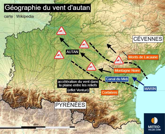 L'autan est également un vent régi par la géographie. En effet, ce vent de sud-est tire son origine du vent marin venu du golfe du Lion. Ce dernier va ensuite s'accélérer en arrivant dans les plaines situées entre les reliefs des Pyrénées et du sud du Massif Central, suivant notamment le Canal du Midi. Comme elles sont piégées entre les reliefs, ces vallées vont concentrer le vent et causer son renforcement. C'est ce que l'on appelle l'effet Venturi. C'est le même principe que pour le mistral, vent de nord qui s'accélère dans la vallée du Rhône, entre Alpes et Massif Central.