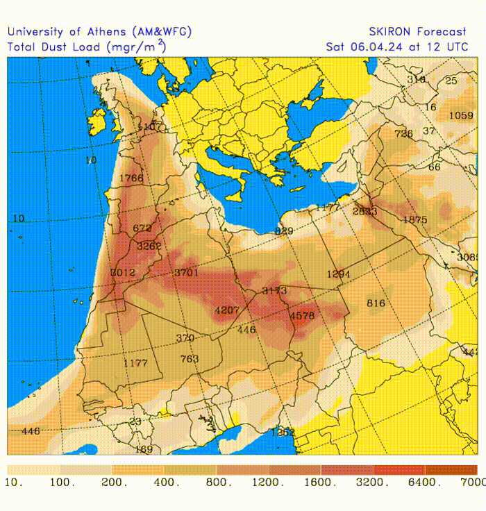 Advection de poussière de sable du Sahara sur la France et l'Europe de l'Ouest entre le Samedi 06 et le Lundi 08 avril 2024 - Skiron