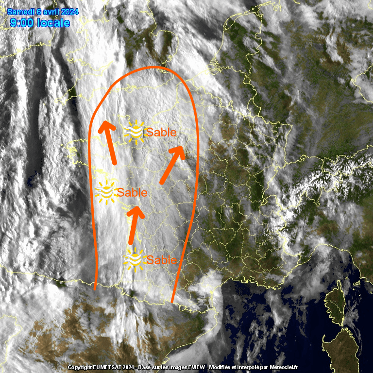 Image satellitaire nationale du nuage de sable, son expansion et son aspect caractéristique en peau d'orange - Canal Visible MeteoCiel