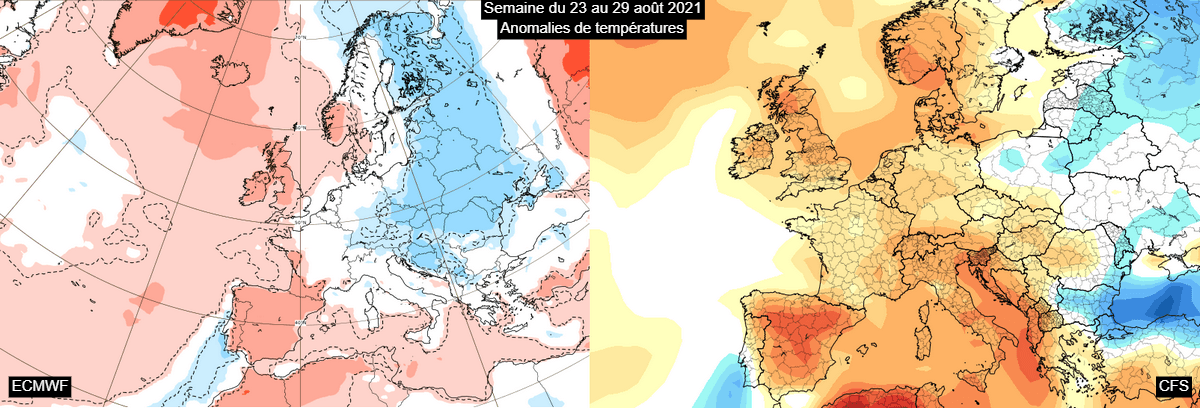 Anomalies de températures durant la semaine du 23 au 29 août sur la France – ECMWF et CFS