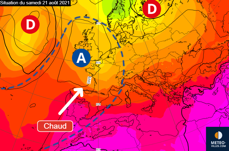 Situation envisagée pour le samedi 21 août 2021 sur l'Ouest de l'Europe – Modèle ECMWF, modifié par Météo-Villes