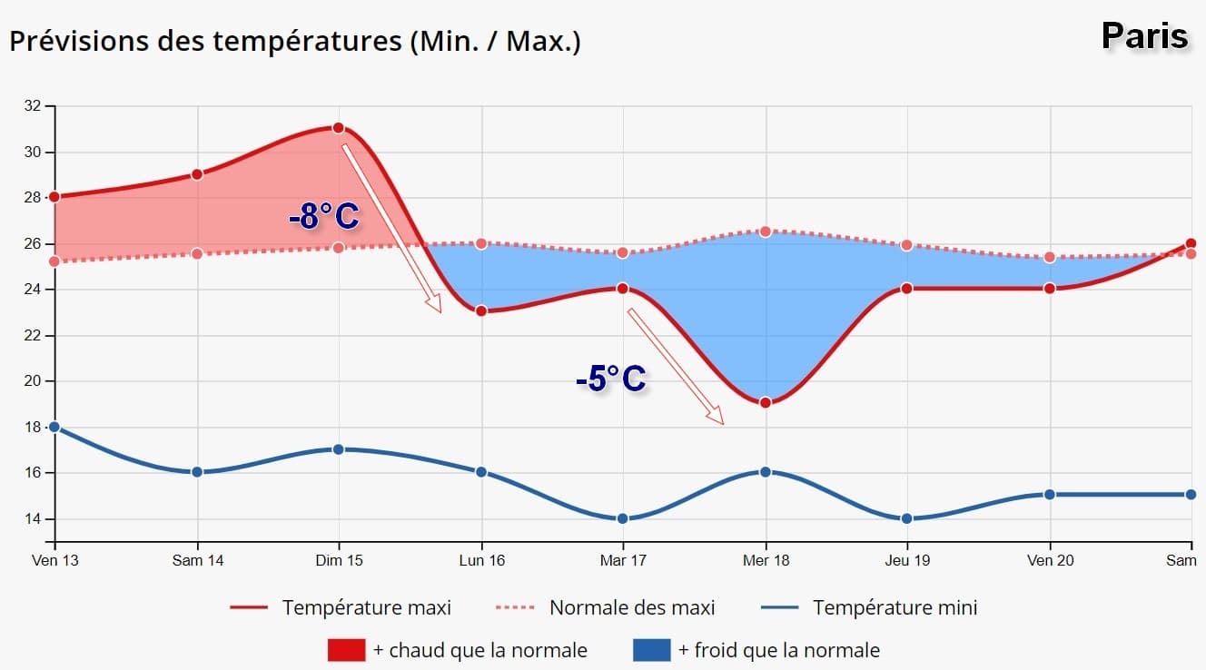 Au niveau des températures, la chaleur de cette fin de semaine va rapidement (même très rapidement) laisser place à de l'air océanique et un ressenti bien plus frais sur une large partie du pays. Par exemple, ce dimanche 15 août les températures pourraient dépasser les 30°C sur Paris contre une maximale de 19°C envisagée mercredi 18 août, soit une chute de 12°C en 3 jours au niveau des maximales !