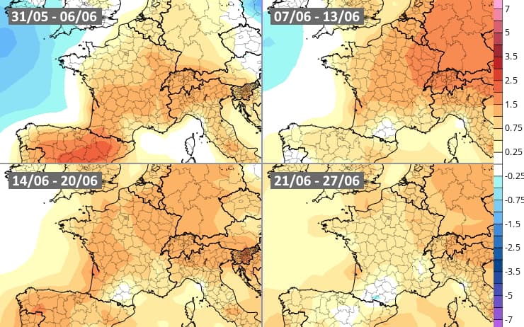 Le modèle européen mise sur un début juin encore relativement frais sur les régions du nord, de saison dans le sud. La tendance s'inverserait très progressivement au cours de la suite du mois avec l'apparition d'anomalies chaudes à partir de la mi-juin sur l'ouest et le sud de la France. La chaleur pourrait se montrer plus nette au cours de la dernière décade de mai 2021 sur les régions méridionales. Le nord, quant à lui, connaîtrait un mois plus classique.