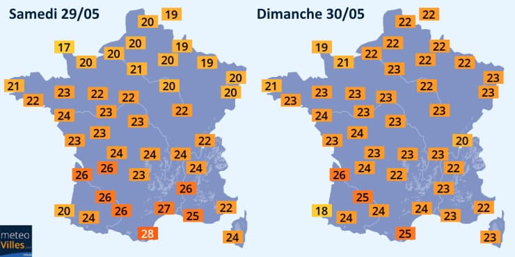 Prévisions des températures maximales pour les samedi 29 et dimanche 30 mai 2021 - Météo Villes