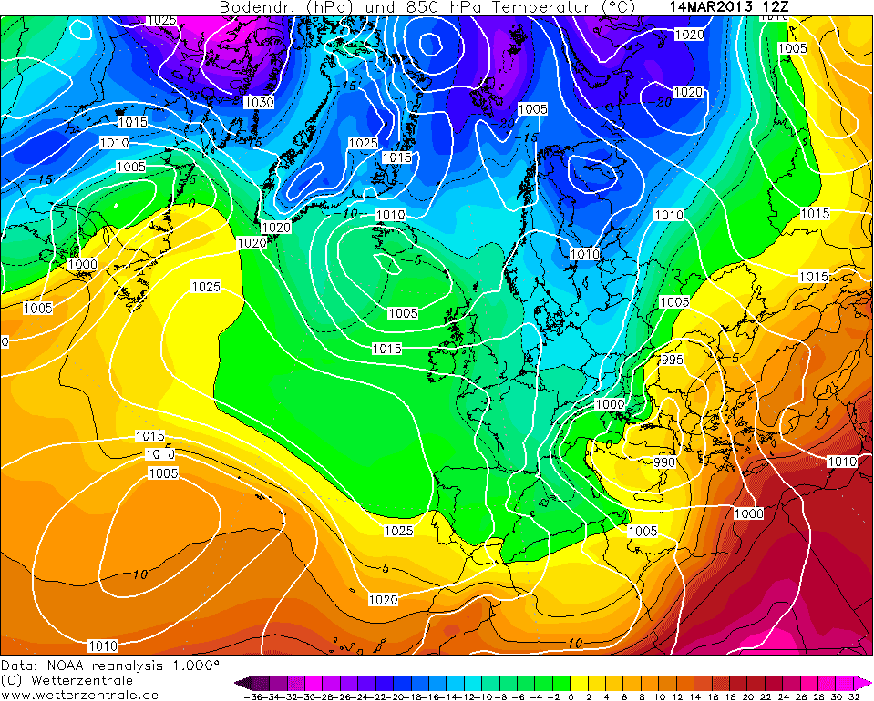 L’impressionnante descente froide de la mi-mars 2013 ! Réanalyse des températures à 850 hPa pour le 14 mars 2013  Via Wetterzentrale.de