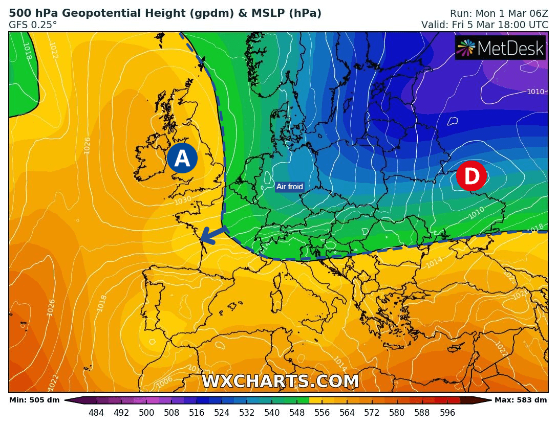Schéma de la situation atmosphérique sur l’Ouest de l’Europe vendredi 5 mars 2021 – Modèle GFS via WX CHARTS