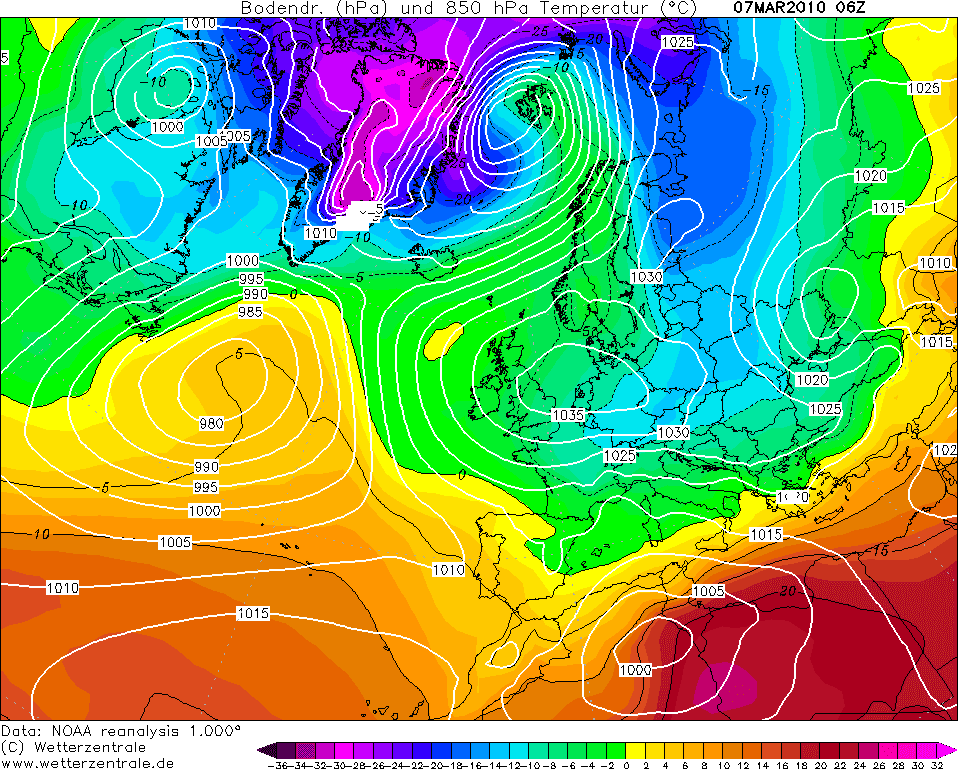 Réanalyse des températures à 850 hPa pour le 7 mars 2010  Via Wetterzentrale.de