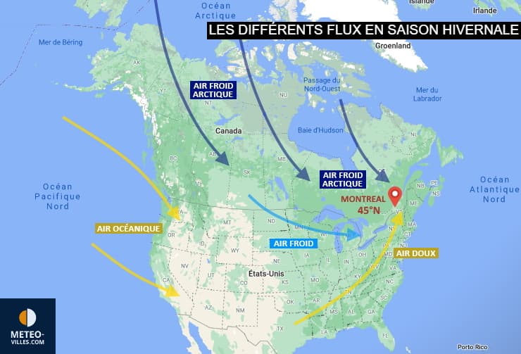 Schéma des flux en Amérique du Nord durant la saison hivernale - Météo Villes (fond Google Maps)