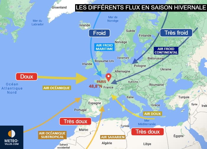 Dans les faits, le seul flux capable d'amener un froid glacial en France est le flux d'est à nord-est (le fameux Moscou-Paris), car ce dernier ne rencontre aucune mer au dessus de laquelle il pourrait considérablement se réchauffer. C'est pour cette raison que le flux de nord n'apporte qu'un froid modéré dans notre pays car contrairement à l'Amérique ou à la Russie, l'air froid venu du pôle doit d'abord circuler au dessus des mers de Norvège et du Nord avant de nous atteindre. Comme celles-ci sont relativement douces (aucune banquise), elles atténuent le froid avant qu'il n'arrive en France. Pour une vague de froid en France : un flux d'est à nord-est est requis.