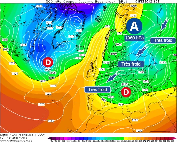 Situation du 1er février 2012 lors de la dernière vague de froid majeure en France - via wetterzentrale.de