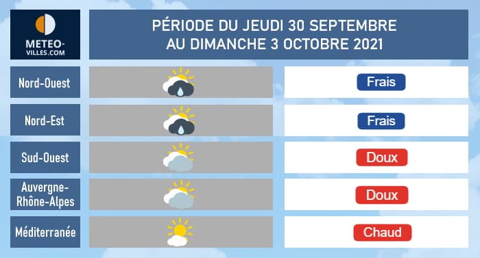 Projection du temps et des températures pour la période du 30 septembre au 3 octobre 2021 - Météo Villes