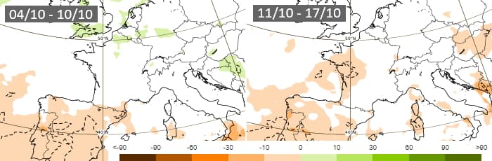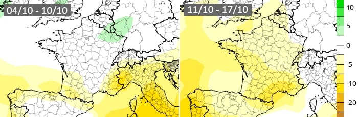 Le modèle américain ne modélise pas d'anomalie pluviométrique nette du 4 au 10 octobre, à l'exception d'un temps plus sec que la normale au sud-est. Cette tendance un peu plus sèche que la normale s'étendrait du 11 au 17 octobre. Concernant le modèle européen, aucune anomalie franche ne se détache. La semaine du 11 au 17 octobre pourrait être un peu plus sèche que la normale dans l'ouest.