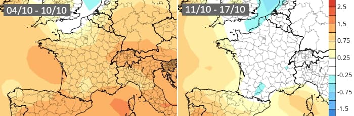 Le modèle américain modélise un temps plus doux que la normale pour la semaine du 4 au 10 octobre, suivi d'une semaine plus fraîche et tout juste dans les normales du 11 au 17 octobre. Le modèle européen, quant à lui, ne modélise pas d'anomalie particulière et s'attend donc à des températures proches des normales sur les deux semaines.