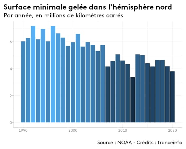 La fonte des glaces est l'un des éléments les plus révélateurs de l'augmentation des températures à échelle mondiale. On note depuis les années 1990 une accélération de la fonte de la banquise et des glaciers. Ainsi, la surface minimale recouverte de glace dans l'hémisphère nord est passée d'une moyenne de 6 millions de kilomètres carrés dans les années 1990 à moins de 4 millions de km2 en 2020, une baisse d'un tiers !