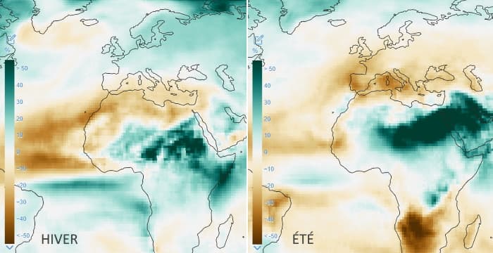 Évolution de la pluviométrie d'ici 2100 en hiver (décembre-février) et en été (juin-août) - via IPCC