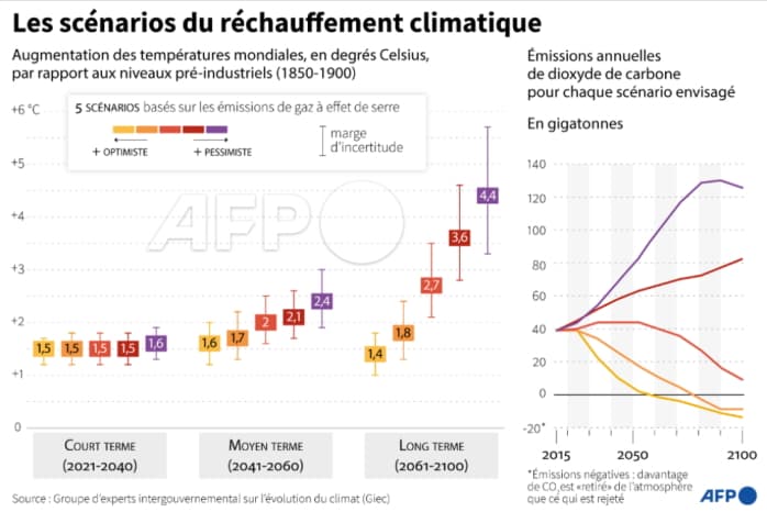 Projection du réchauffement climatique d'ici 2100 selon les émissions de CO2 - via AFP