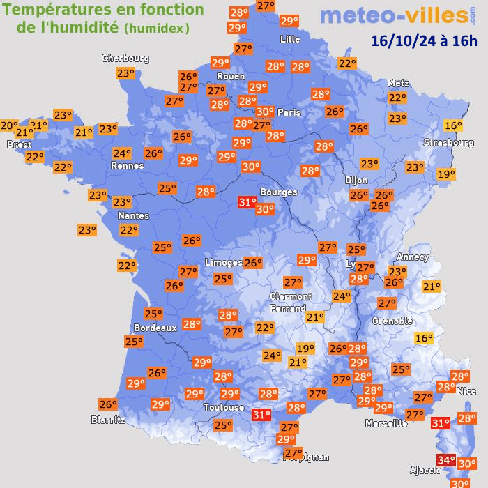 Humidex (ressenti en fonction de l'humidité) le mercredi 16 octobre 2024 à 16h - Météo Villes