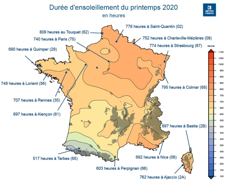 Ensoleillement en France au cours du printemps 2020 (de mars à mai) - via Météo France
