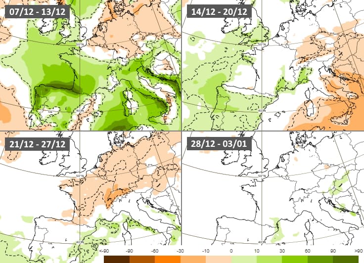 Concernant les précipitations, le scénario du modèle européen montre des cumuls importants cette semaine, en particulier sur le sud-ouest du pays. Les conditions redeviendraient plus classiques la semaine prochaine malgré des signaux humides plus net vers la Bretagne et le sud-est. En revanche, la semaine de Noël (du 21 au 27 décembre) pourrait être plus sèche (vers la Méditerranée). Il n'y a pas de tendance franche pour le passage à la nouvelle année.