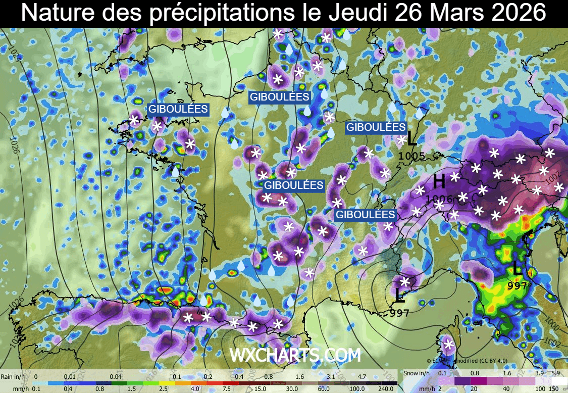 Nature des précipitations le jeudi 26 mars 2026 selon le modèle européen - wxcharts.com