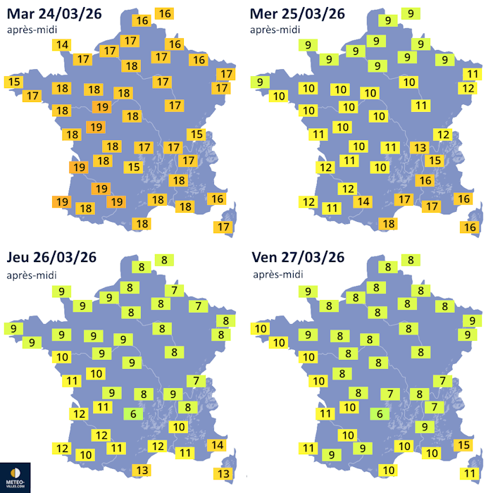 Températures maximales prévues du mardi 24 au vendredi 27 mars 2026 - Météo Villes