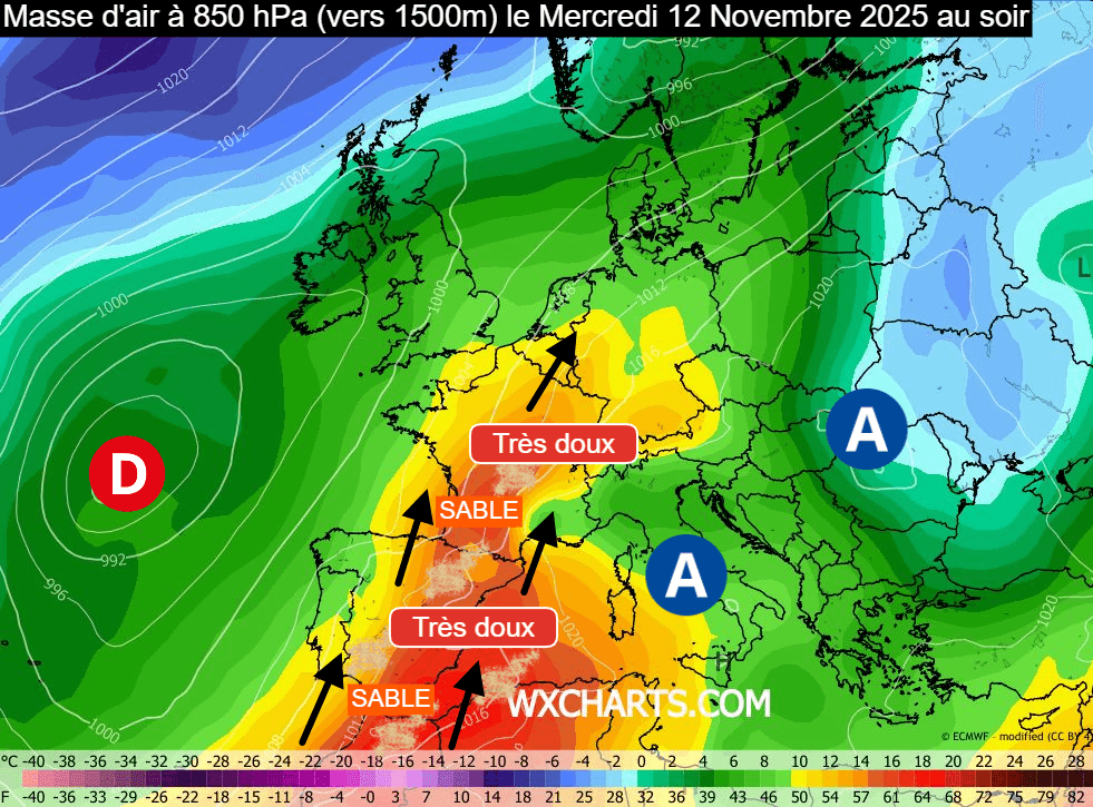 Situation météorologique en Europe ce mercredi 12 novembre 2025 avec remontées de sable - wxcharts.com