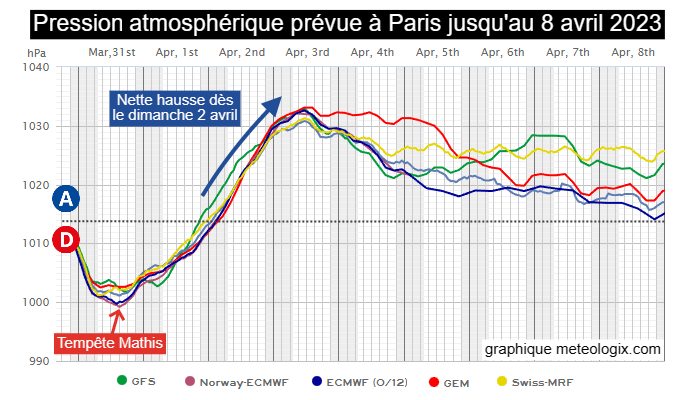 Alors qu'il avait atteint des niveaux remarquablement élevés tout au long du mois de février, le baromètre n'a jamais atteint le seuil des 1030 hPa à Paris durant ce mois de mars 2023, marqué par le retour de conditions plus dépressionnaires. Une fois la tempête Mathis de vendredi passée, les baromètres vont s'envoler durant ce premier week-end d'avril. La hausse s'annonce même spectaculaire ce dimanche 2 avril. À Paris, on devrait gagner un peu moins de 20 hPa en 24 heures, culminant à plus de 1030 hPa lundi. Les pressions resteraient ensuite anticycloniques la semaine prochaine, bien qu'elles baisseraient lentement.