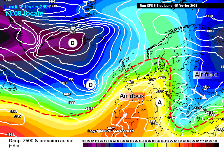 Schéma de la situation atmosphérique sur l’Ouest de l’Europe ce lundi 15 février – Modèle GFS via meteociel.fr