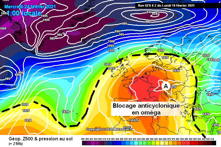 Schéma de la situation atmosphérique sur l’Ouest de l’Europe pour le mercredi 24 février 2021 – Modèle GFS via météociel.fr