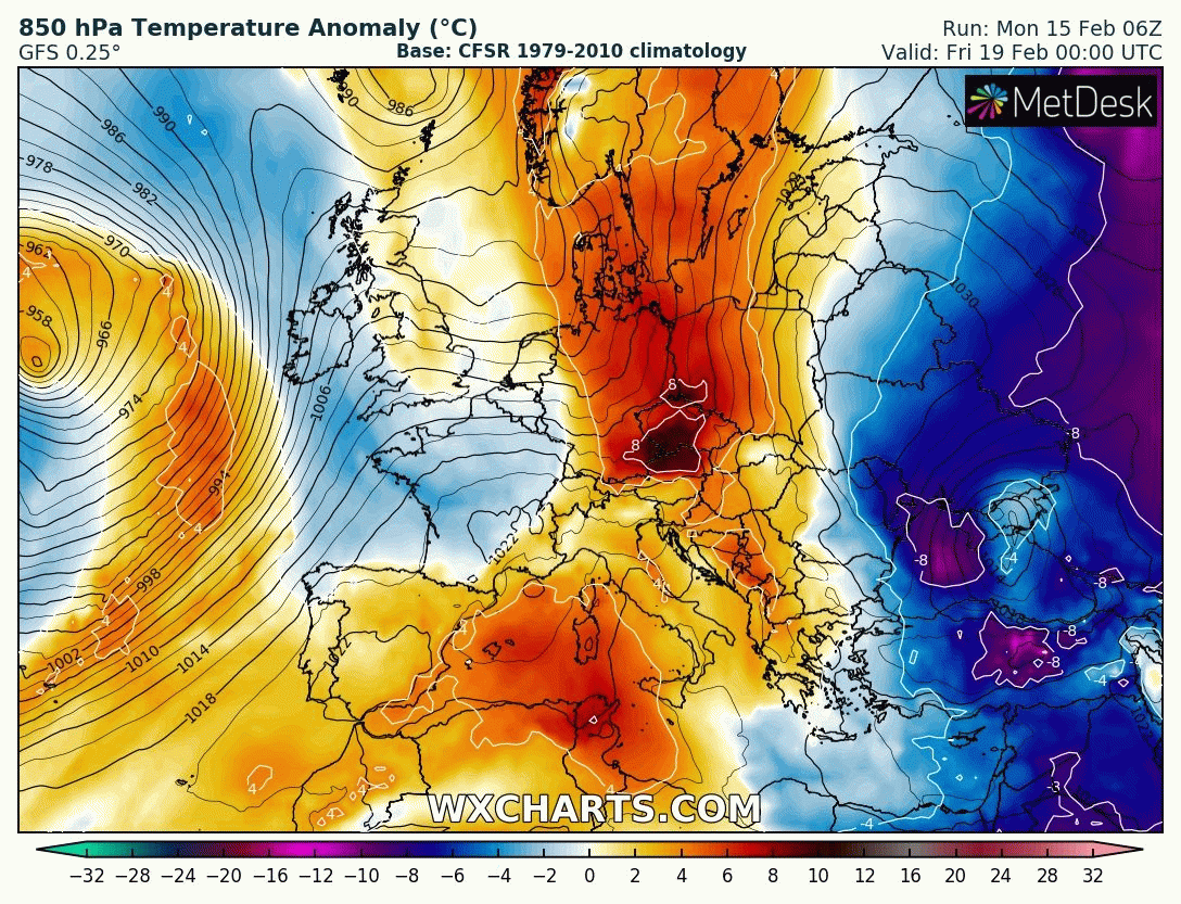 Animation des températures à 850 hPa sur l’Ouest de l’Europe entre lundi 15 et samedi 20 février – Modèle GFS via WXCHARTS